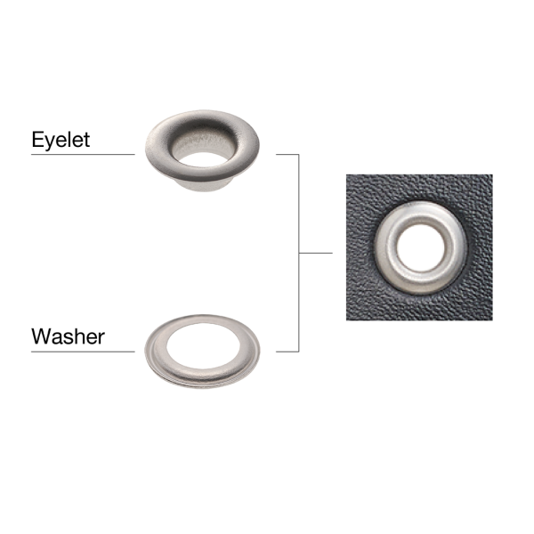This is a two-part brass system comprising of an eyelet and washer. This combination of eyelet and washer forms a secure attachment on the fabric. The YKK eyelets are self-piercing and can be attached to elasticated fabrics.