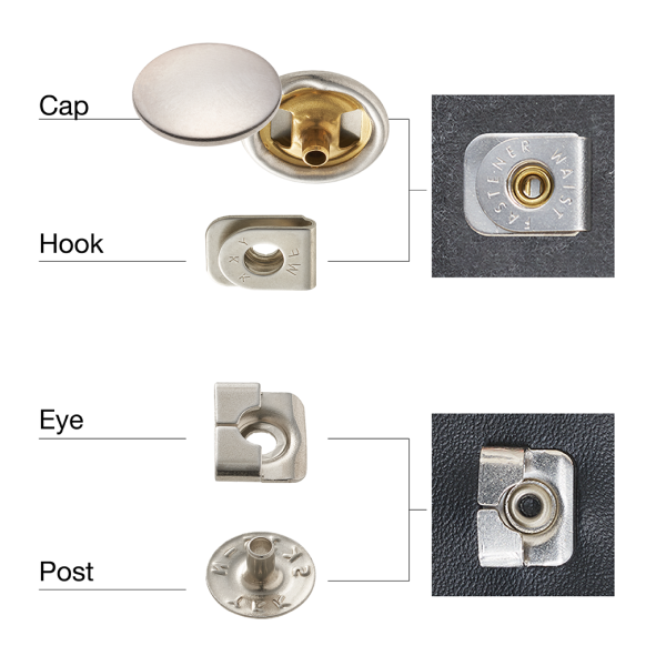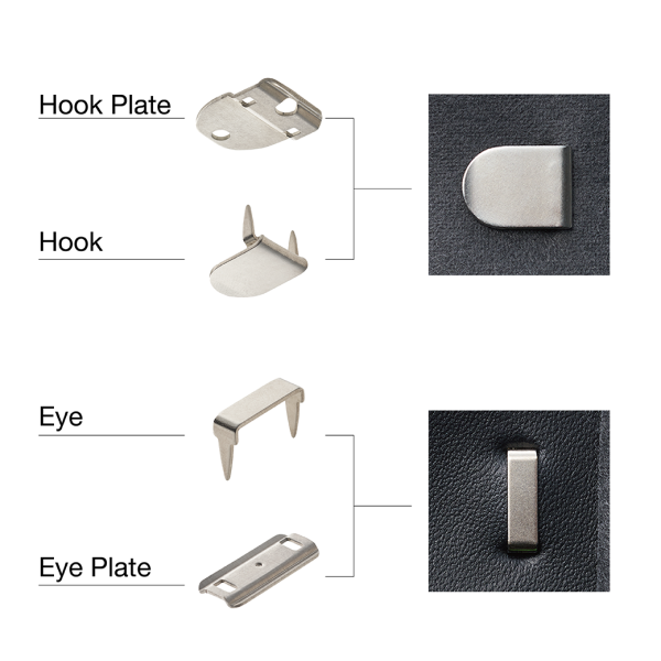 YKK’s non-ferrous HU10 is a four-part system, comprising a Hook, Hook Plate, Eye, and Eye Plate. The Eye and Hook are made of brass, with the Hook and Eye plate (underparts) being made from aluminium. This product is ideal for formal trousers and ladies’ skirts. The HU10 utilises a double-pin hook.