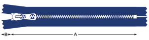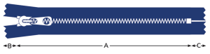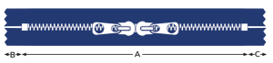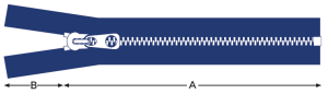 | Open-end zipper | From the top end of the slider to the tip of the box | From the top stop to the cut end