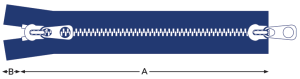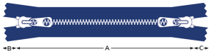 | Zipper with double sliders (arranged in head-to-head relation) | From the tip of one bottom stop to the tip of the other bottom stop | From the upper bottom stop to the tip of notches of the cut end