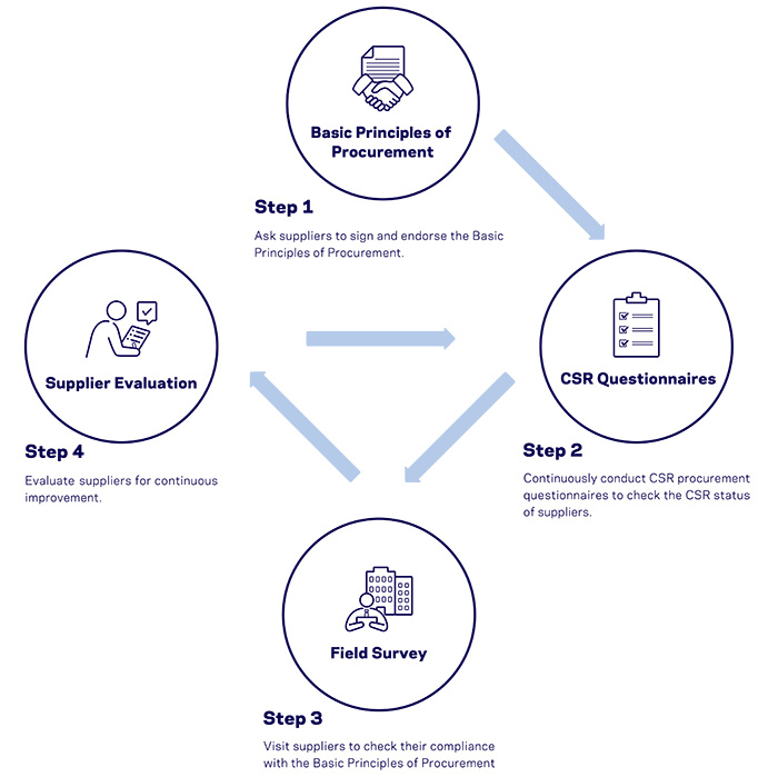 We encourage and pursue procurement from business partners whose employment conditions and health and safety standards, including remuneration and working conditions, comply with the laws and regulations of the countries and regions in which they conduct their activities, and who promote the creation of workplaces where employees can work with peace of mind.
