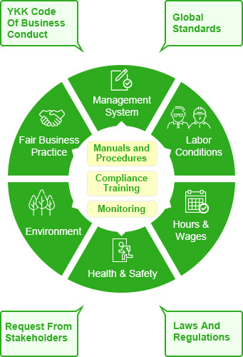 YGCC, YKK Global Criteria of Compliance, is YKK’s CSR guideline, which was created based upon YKK’s philosophy of the “Cycle of Goodness” and the ISO26000 guidelines. It is formulated to embody our contribution to a sustainable society through our core business.
